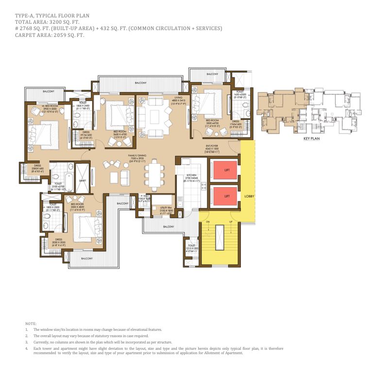 Details Area Total Area 3200 sq. ft. Built-up Area 2768 sq. ft. Common Circulation + Services 432 sq. ft. Carpet Area 2059 sq. ft.