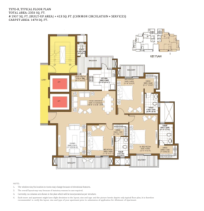 Details Area Total Area 2350 sq. ft. Built-up Area 1937 sq. ft. Common Circulation + Services 413 sq. ft. Carpet Area 1470 sq. ft.